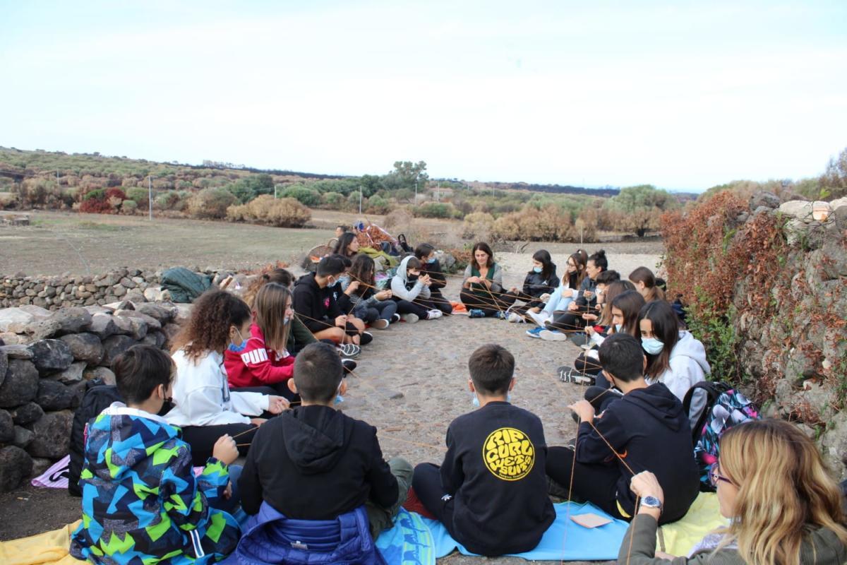Le volontarie ci hanno descritto come all’inizio l’albero, era maestoso aveva un diametro di circa 10 metri e un’altezza di circa 16 metri, ma che rimane e solo il tronco. A terra ci sono dei rami completamente inceneriti, sembra quasi che i rami siano le braccia di una persona sofferente, questo albero ha resistito a temperature assurde, circa dopo 3-4 giorni ci raccontano che il suolo raggiungeva una temperatura di circa 50 gradi. Una delle volontarie dopo qualche minuto di silenzio, forse per farci realizzare il danno immenso per questo albero e non solo, ci hanno chiesto, se secondo noi l’albero fosse ancora vivo o morto. Alcuni di noi pensavano fosse morto altri vivo: loro hanno preferito risponderci, facendoci fare una sorta di gioco… hanno tirato fuori un gomitolo di lana, una ragazza si è legata l’inizio del filo in una mano, poi dopo essersi presentata e aver detto cosa amava fare ha lanciato il gomitolo, verso uno di noi, che a sua volta ha compiuto lo stesso gesto…alla fine eravamo tutti legati gli uni agli altri come in un reticolo. Alcuni di noi pensavano fosse una ragnatela, altri che fossero di quei laser invisibili per i ladri nelle banche… ma ci sbagliavamo tutti. Questi fili rappresentavano delle radici e ricollegandoci all’ulivo secolare ci hanno rifatto la domanda…” se uno di noi molla il filo il reticolo perde forza e forma, serve il sostegno e la forza di tutti. Li abbiamo capito che l’albero anche se apparentemente morto sotto terra, ha l’aiuto prezioso delle altre piante vicine che con le loro radici gli portano le sostanze nutritive appunto essenziali per la vita.