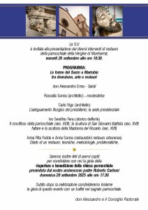 - venerdì 26 settembre, ore 18,30, nella chiesa parrocchiale, incontro per la presentazione dei diversi interventi da parte delle maestranze coinvolte (vedi programma in allegato).